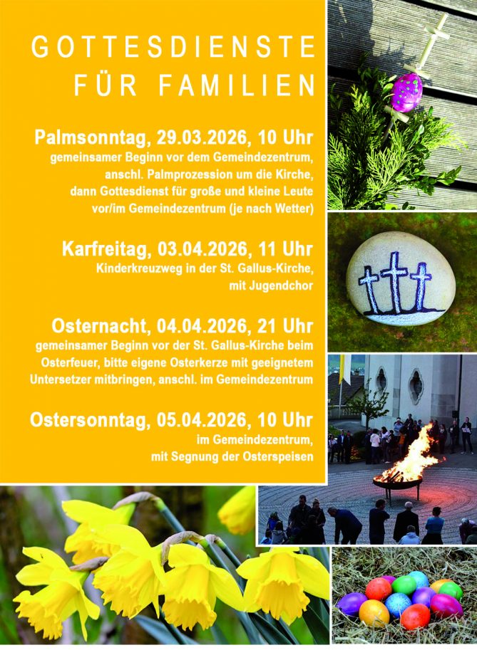 Auch für kleine und große Leute finden zu den Kar- und Ostertagen wieder verschiedene Gottesdienste statt. Zeit und Ort bitte dem Plakat entnehmen.