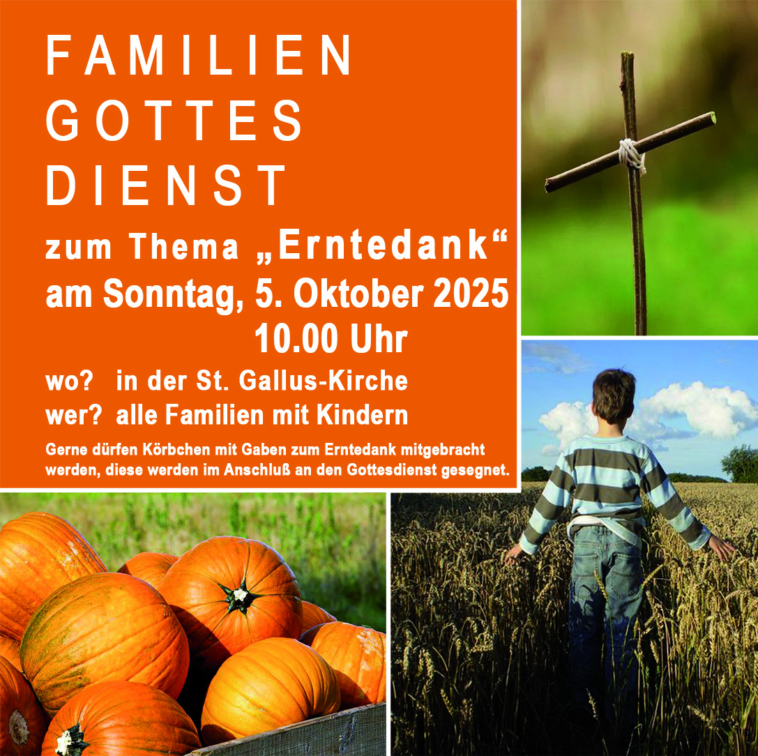 Alle Familien mit Kindern sind herzlich zum Familiengottesdienst zum Thema „Erntedank am Sonntag, 5. Oktober 2025, eingeladen.