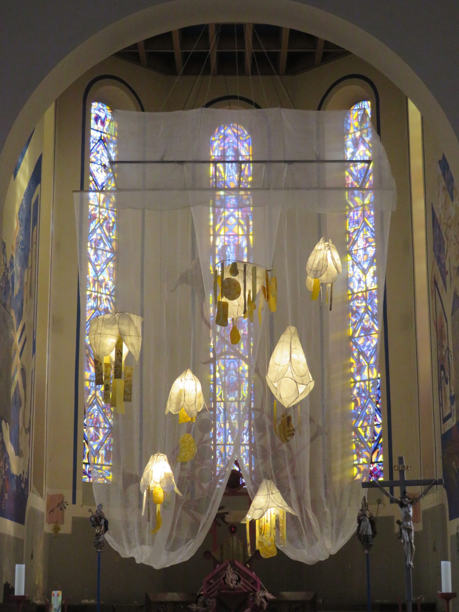 Auch in diesem Jahr haben Schülerinnen und Schülern mit den Lehrerinnen des Kunstprofils am Montfortgymnasium das Fastentuch in der St. Galluskirche gestaltet. Es greift das Thema der Fastenpredigtreihe auf „Schalom – Frieden ist möglich“. Zu sehen sind sieben Blüten aus weißem Transparentpapier. Sie werden jeweils durch eine LED-Leuchte erhellt. Daran hängen Blütenpollen aus gelb-orange Bänder. Auf den Bändern stehen Gedanken zum Thema Frieden. Dahinter hängt wie ein Vorhang ein Hagelschutznetz, das sich zum Lebensbaum hin öffnet. Die sieben Blüten stehen für die sieben Kontinente der Welt. Die Blüten wirken sehr filigran und zerbrechlich, wie es der Friede auch oft ist. Die Blütenpollen machen deutlich, dass die Blüten einmal zu Früchten werden können. Aber der Friede muss wachsen, durch das Zutun viele Menschen. Das warme Licht in der Blüte wirkt wie ein Friedenslicht, das das Dunkle in der Welt verdrängen kann. Der Vorhang dahinter, das Hagelschutznetz, schützt im Obstbau die Früchte vor Schaden. Doch es wird auch noch anders verwendet: Im Ukrainekrieg werden diese Netze über die Straße gespannt, um die Menschen und Fahrzeuge, die darauf unterwegs sind, vor Drohnenangriffen zu schützen. Danke an Johannes Junker, der sich um die technische Umsetzung kümmerte und der Schulgemeinschaft des Montfortgymnasiums für diesen ermutigenden Friedensappell.