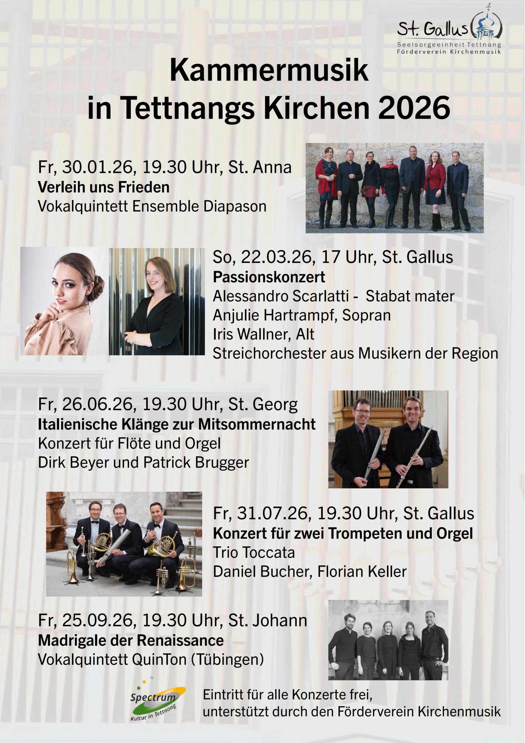 Auch im Jahr 2026 erwarten Sie zahlreiche Konzerte der Reihe „Kammermusik in Tettnangs Kirchen“. Freuen Sie sich schon heute auf vielseitigen Hörgenuss.